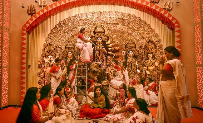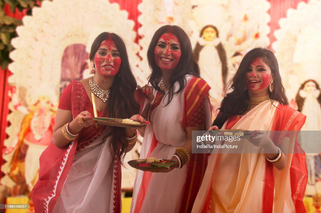 Eighth day for people in this part of India is traditionally Durgashtami and is of the most importance. Most of the pandals on this day are themed around exquisitely crafted and decorated life-size clay idols of the goddess Durga slaying the demon Mahishasura A demon king with a buffalo head. These idols are then worshipped for five days and immersed in the river on the fifth day. While the North and South parts of India don’t really have any specific outfits for this festival, East and West do. In east India, women wear their gorgeous red and white bengali sarees for this puja and men dress up in the traditional kurta-pyjama outfit.