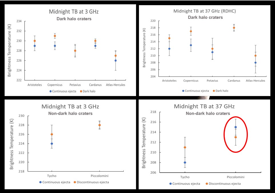 - The passive microwave data (brightness temperature TB) from the MRM shows slightly warmer brightness temperatures for the dark haloes compared to the continuous ejecta. This indicates that the microwave emissions in the halo regions are coming from warm rocks at greater depths.