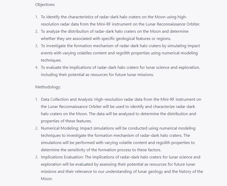My first impression is that the wording sounds too redundant- almost as if some first-year student overused the thesaurus. But overall, the writing still feels like a legit research proposal (at least it would to an unseasoned person). However, the main issue is with its scientific accuracy. Now, I understand that my sample size is too small to come to that conclusion, and maybe others had more success getting an accurate description, but it’s true for this one case. I’ve learned a lot about these RDHCs over these past two years and there haven’t been many references to their volatile (e.g. water ice) content and its relation to the halo’s appearance. So, I’m confused, where is that coming from!? (Maybe there’s a paper out there I overlooked during my initial lit review.) My point is, to someone who is not too familiar with this research topic, ChatGPT gave a very ‘real-looking’ research proposal, but, in reality, it’s full of inaccuracies and repetitive sentences.